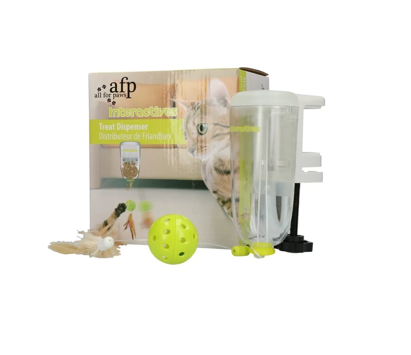 Ein neues herausforderndes Belohnungsspielzeug von AFP Interactives für Ihre Katze. Dieser Spender belohnt Ihre Katze, wenn das Spielzeug mit einer Feder gefangen wird. Der AFP Interactive Treat Dispenser ist lässt sich praktisch an jedem Tisch oder Gestell befestigen, der Dispenser wird befüllt und der Spass kann losgehen. Sobald Ihre Katze an der Feder zieht, fallen einige Leckerlis runter und nach dem Naschen, kann der Spass weitergehen.