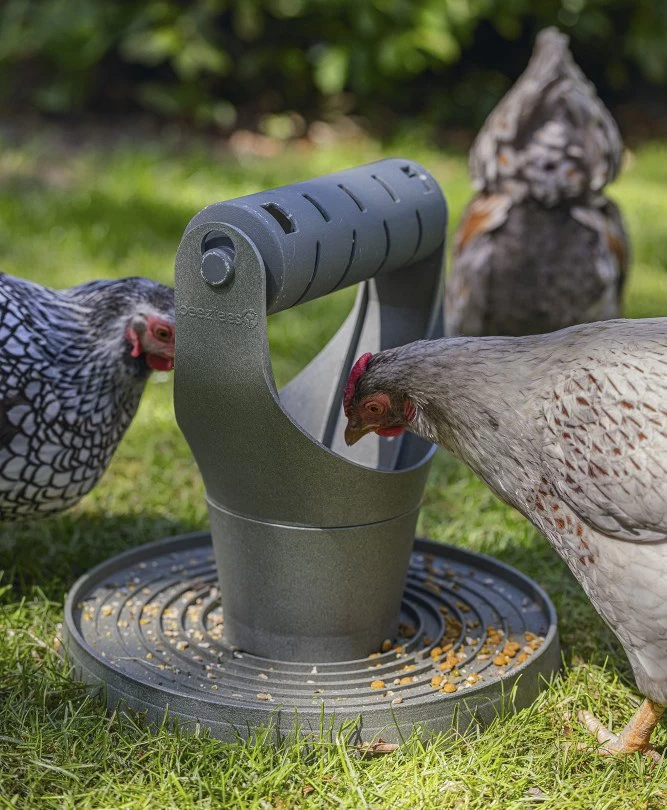 Der Hühner Spiel- und Snackturm von Beeztees belohnt Ihre Hühner für richtiges Denken und Handeln. Das Produkt hat eine Snackrolle und einen Auffänger. Die Rolle hängt über dem Auffangbecken und ist an den Seiten angemacht, wenn das Huhn jetzt die Rolle anpickt wird sie sich drehen und die Belohnung fällt heraus. Ein echter Denk und Spielspass für Ihre Hühner. Durch die Regenrinnen im Auffangbecken läuft das Regenwasser.
