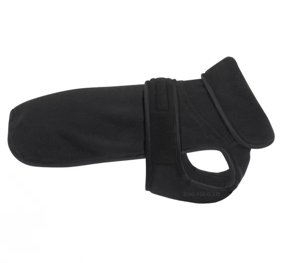 Ein schwarzer Mantel aus 100 % Fleece mit umlaufendem Verschluss für Hunde, die es gerne gemütlich haben.