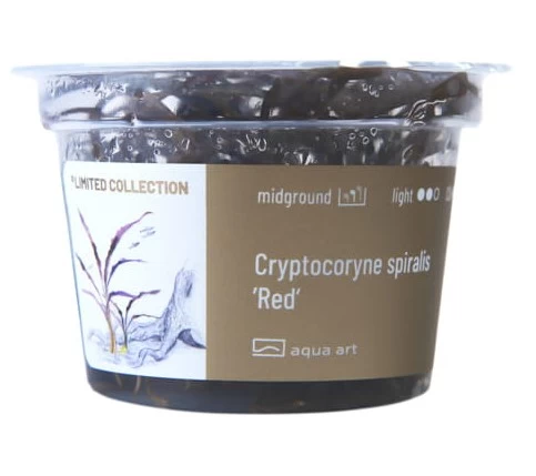 Die rote Cryptocoryne Spiralis bildet einen guten Kontrast zu den grünen Pflanzen und ist ideal für den Hintergrund des Aquariums. Sie ist originell und ungewöhnlich, so dass sie eine zum Blickfang wird.