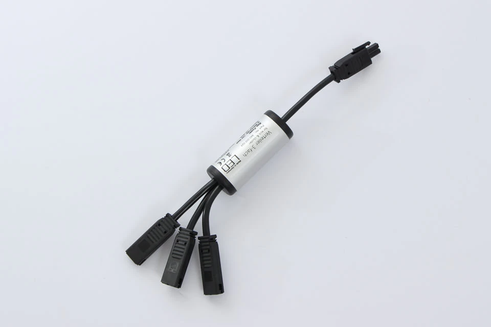 Ermöglicht den Anschluss von bis zu 3 eco- und/oder cluster-Leuchten an einen Converter bzw. einer Lichtsteuerung. Die Gesamtleistung der Leuchten darf die Converter-Nenn-Leistung nicht überschreiten.