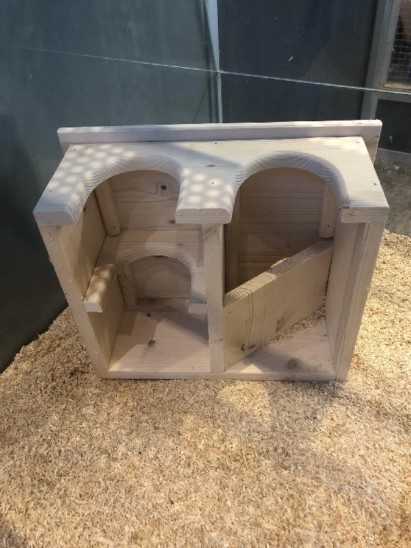 Dieses Kleinnagerhaus verfügt über drei Kammern und einer Klettertreppe mit Dachöffnung. Die kleinen Nager können sich darin verstecken, Klettern und sich einnisten.