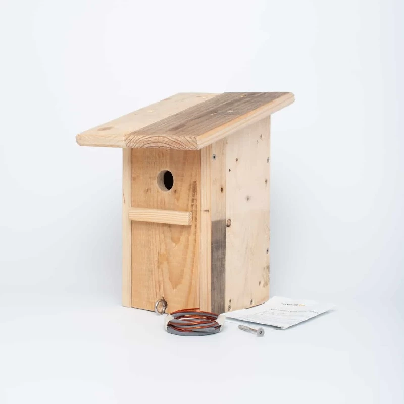 Der Nistkasten kann mit dem beiliegenden Kabel oder den Schrauben an einer Fassade oder am Baum befestigt werden.