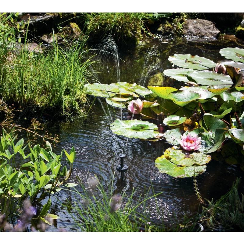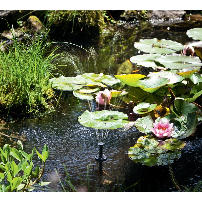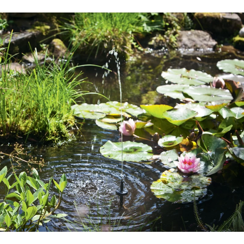 Die Pumpe kann im Dauer- oder im Timerbetrieb (läuft jede Stunde für 15 Min) betrieben werden. Die Ausgangsspannung der Akkubox kann zwischen 6 V und 9 V geregelt werden. Die Förderleistung der Pumpe ist einstellbar und es können mit den beiliegenden Steigrohren und 4 unterschiedlichen Sprinklern unterschiedliche Fontänen erzeugt oder über einen Schlauch Wasserspeier oder kleine Quellsteine betrieben werden.
