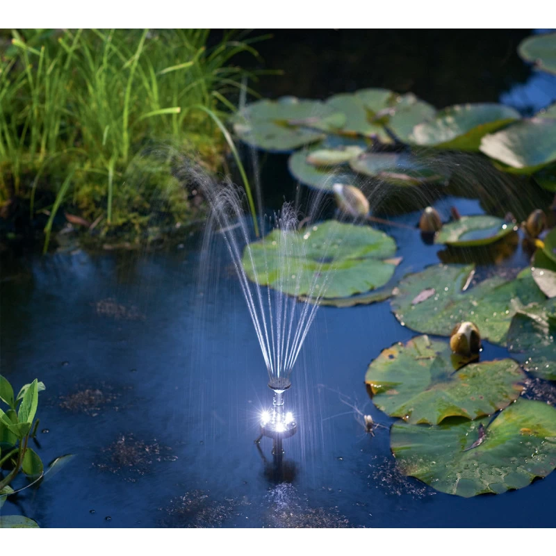 LED Beleuchtung für Wasserspiel Pumpe mit Trockenlauf- und Überlastungsschutz in Verbindung mit einem kristallinen Solarmodul und Akkuspeicher. Montage des Moduls durch Erdspiess. Einstellbar zur Sonne mittels Kugelgelenk. Bei Sonnenschein wird die elektrische Energie im Akku gespeichert. Wird die Wiedereinschaltschwelle erreicht, dann schaltet sich die Wasserpumpe automatisch ein. Bei Dunkelheit schaltet sich dann automatisch die LED Beleuchtung ein und sorgt für einen tollen Lichteffekt.
