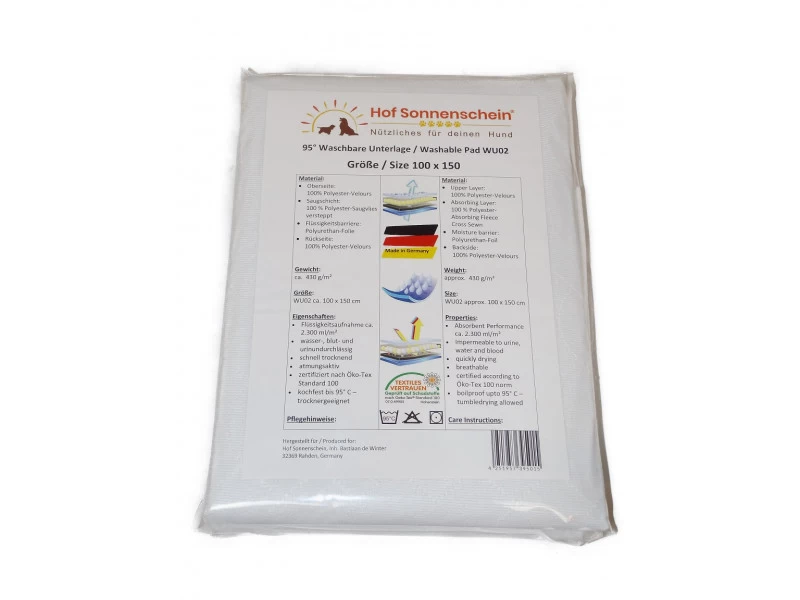 Die waschbaren Unterlagen von Hof Sonnenschein werden von Züchtern sowie von Hunde- und Katzenhalter mit älteren, inkontinenten Tieren sehr geschätzt. Die Unterlagen können überall platziert werden und saugen die Nässe (Urin, Fruchtwasser usw.) hervorragend auf. Danach sind die Unterlagen waschbar bis 95° C.