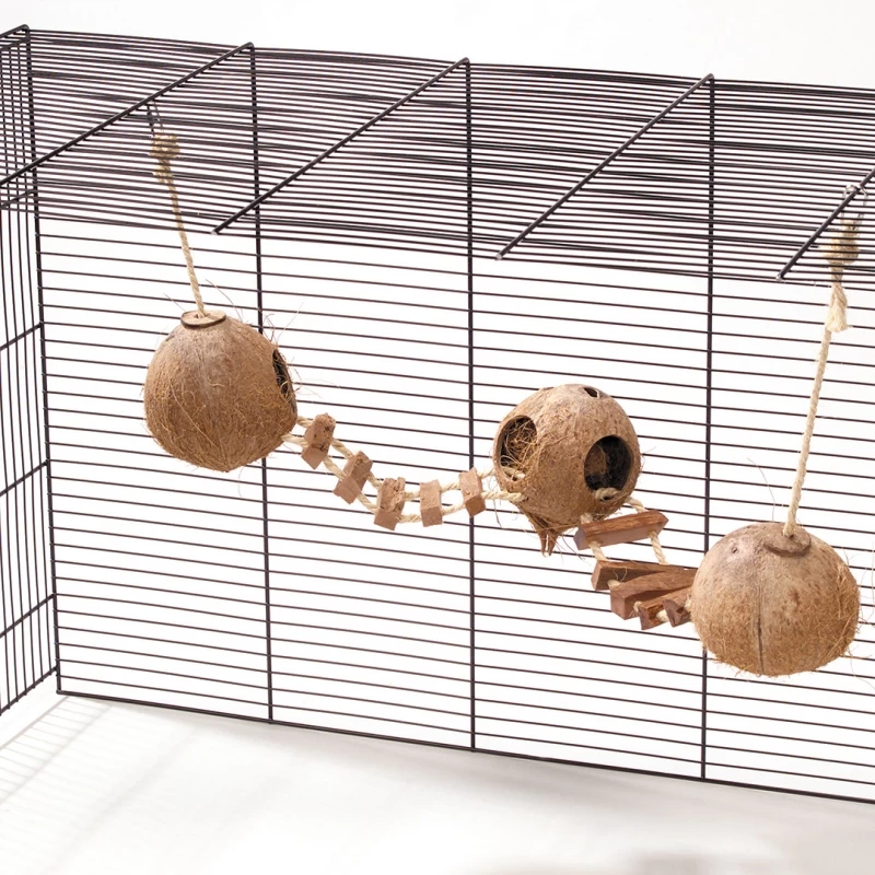 Diese Kokosnuss-Leiter-Kombination von ebi besteht aus 3 Kokosnüssen und zwei Leitern mit Holzstücken dazwischen. Die Öffnungen der Kokosnüsse sind verschieden gross, da es sich um ein Naturprodukt handelt. Wir empfehlen diesen Einrichtungsgegenstand für Hamster und Mäuse. Die Endstücke können am Gehege befestigt werden und sind so stabil verankert. Ihr Nager wird sich über die spannende Abwechslung freuen und Sie werden Ihren Spass daran haben, dem Geschehen zuzuschauen.