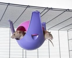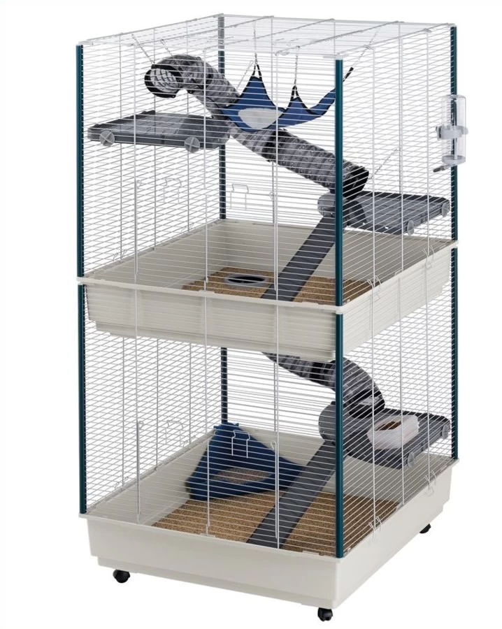 Das Heim eignet sich für Ratten und hat mit dabei 3 Etagen, 2 Plastiknäpfe, 2 Leitern, eine Tränke, 2 Röhrenbausysteme und eine Hängematte