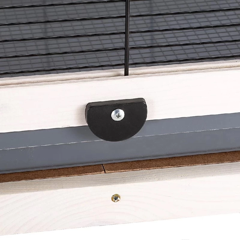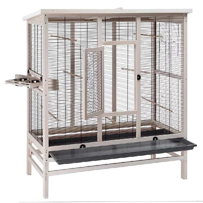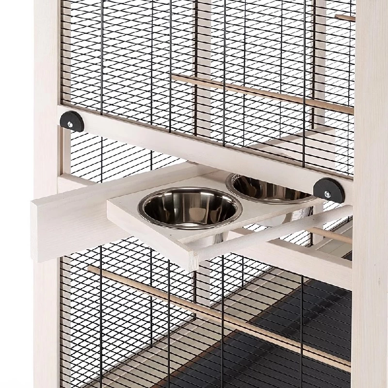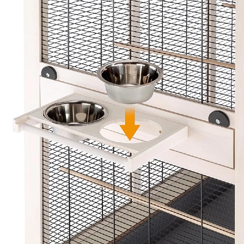 Die geräumige KunststofFSC®hublade am Boden ist ausziehbar, perfekt um herabgefallene Schmutz- und Speisereste aufzufangen und einfach zu entsorgen. Im geschlossenen Zustand wird sie mit speziellen Haken an der Vorderseite von aussen verriegelt. Die Voliere ist komplett ausgestattet mit unverzichtbarem Zubehör wie Sitzstangen und Futternäpfen aus Edelstahl, robust und hygienisch, und einzeln entnehmbar aus dem drehbaren Schüsselhalter, der das Befüllen und die Reinigung erleichtert.