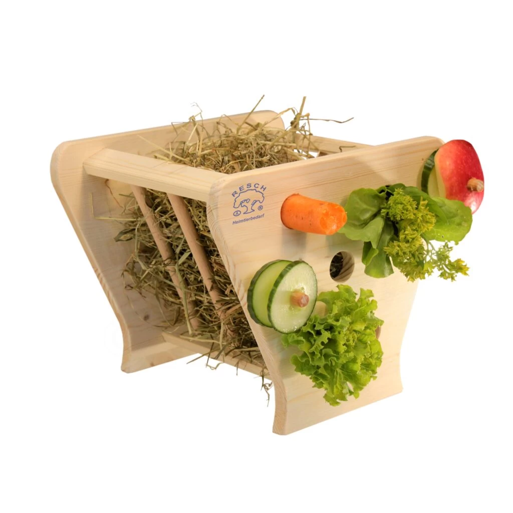 Die Futterkrippe ist ein einfacher Weg seine Nagetiere, mit wenig Aufwand, zu füttern und ihnen gleichzeitig Abwechslung zu bieten. Sie besteht zu 100 % reinem und unbehandelten Fichtenholz. Im Inneren kann man Heu auffüllen, das von jeder Seite begehbar ist und an der Seite kann man Obst und Gemüse an Rundstäbe befestigen.