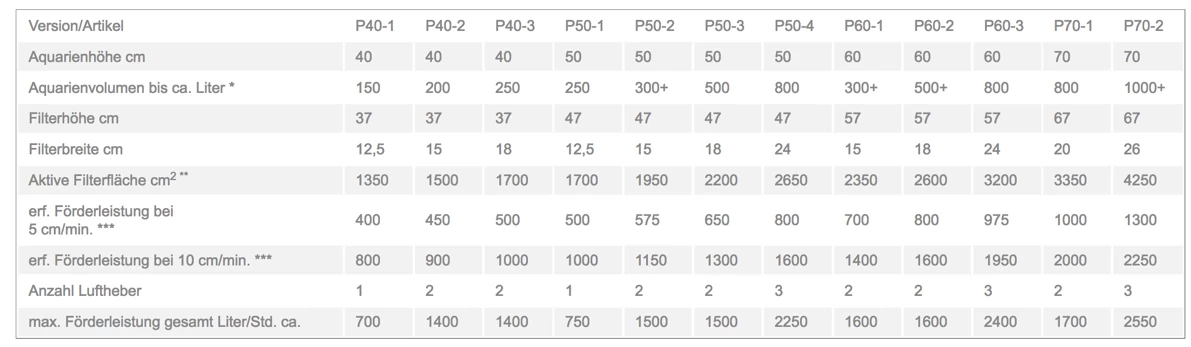 - Bestückt mit 1 bis 3 Hochleistungs-Lufthebern, die jeweils eine Wasserförderung von über 700 L/h bei einer Luftzufuhr von nur ca. 170-180 L/h bringen (Luftzufuhr gemessen in einer Wassertiefe von ca. 35 cm für 50er Aquariumhöhe). Andere Bauformen möglich: Luftheber für ca. 1.000 bis 1.200 L/h.