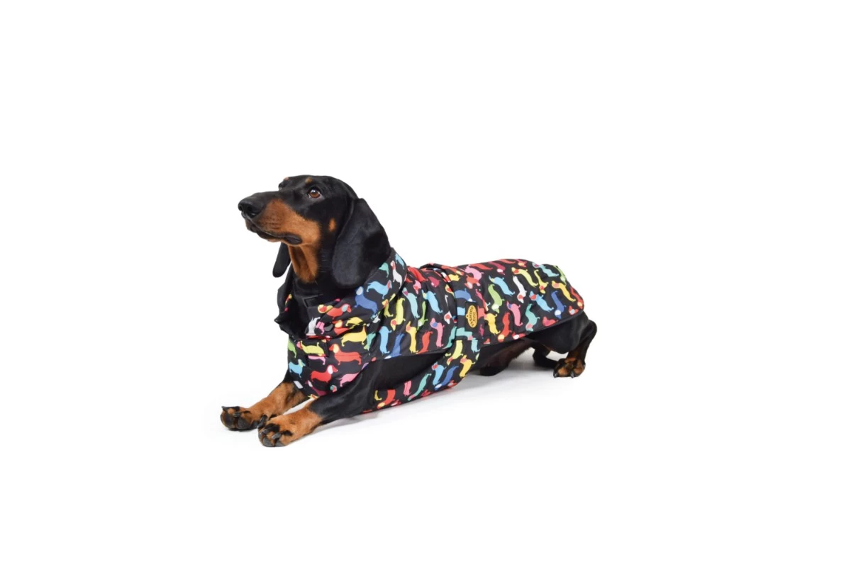 Dieser poppige und fröhliche Dackelmantel ist wasserdicht und wärmend zugleich. Er ist extra für Dackel (Kurzhaar-Dackel oder Langhaar-Dackel) geschnitten und hat somit die optimale Passform für Ihren Vierbeiner.
