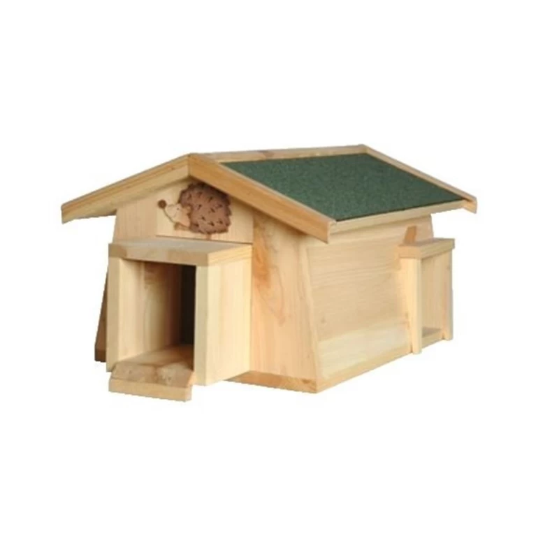 Dieses winterfeste Igelschlafhaus ist der ideale Ort zum Überwintern. Es besteht aus hochwertigem Kiefernholz, hat ein wetterfestes grünes Bitumen Dach und ist robust und langlebig, wenn es draussen platziert wird. Der Eingang ist durch eine spezielle Schleuse geschützt, die Fressfeinden, wie etwa Hauskatzen, den Zugang verwehrt. Ein zweiter Eingang ermöglicht die Unterbringung von zwei Igeln und bietet zudem eine Fluchtmöglichkeit bei Gefahr. Das Dach kann aufgeklappt werden, um eine problemlose Reinigung des Innenraums zu ermöglichen.