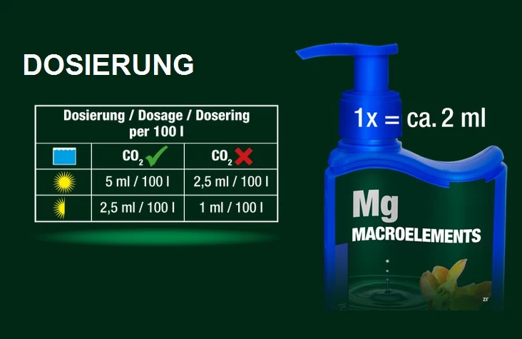 Da der konkrete Verbrauch nicht exakt vorhergesagt werden kann, empfehlen wir die regelmässige Kontrolle des Magnesium-Wertes mit dem JBL Mg Test Set Süsswasser, insbesondere jeweils vor der nächsten Nachdosierung.