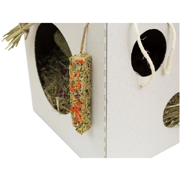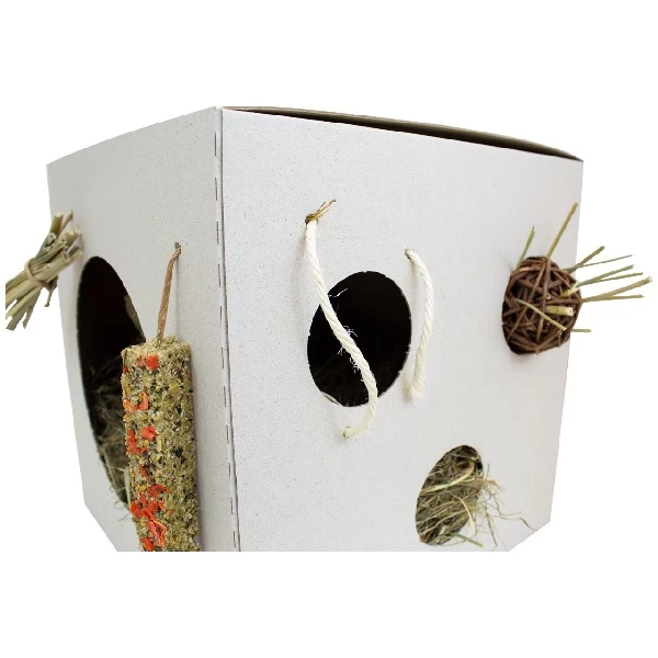 Die Active-Box aus Graskarton ist wie ein grosser Spielplatz für Nager und Zwergkaninchen. Dabei können sich die Tiere so richtig austoben und entdecken gleichzeitig viele Leckereien. Die vorgestanzten Öffnungen lassen sich individuell heraustrennen und machen den Weg frei ins Innere. Dort wartet bereits herrlich duftendes und rohfaserreiches Heu von naturbelassenen Wiesen im Herzen Bayerns auf die Tiere. Ebenso eine bunte Auswahl an Knabber- und Spielideen, die aus der Active-Box einen leckeren Funpark zaubern. Du kannst z.B. mit Hilfe der beigefügten Sisal-Seile den Weidenball oder auch den Schlemmer-Tunnel an beliebiger Stelle am Karton aufhängen, was förderlich für die Bewegung und Geschicklichkeit der kleinen Fellnasen ist. Oder du servierst ihnen den bezaubernd bunten, gesunden Grainless Farmy in der Geschmacksrichtung Karotte & Bockshornklee. Leckere Dillstäbchen – gerne auch an beliebiger Stelle einfach durch den Karton gestochen – regen zum ausgiebigen Nagen an, unterstützen dadurch den Zahnabrieb und wirken gleichzeitig wohltuend auf Magen und Darm. Über die Grainless Drops freuen sich die Heimtiere gerne zwischendrin oder als Belohnung für ihre eifrige Suche, wenn du die Drops vorher im Heu versteckst. Sie sehen: Die Active-Box bietet viele Möglichkeiten, um die Bewegungsfreude der Tiere anzuregen, Langeweile zu vertreiben und gleichzeitig die Tiere mit wertvollen Leckereien zu verwöhnen. Sämtliche Komponenten sind selbstverständlich naturbelassen und daher zum Komplettverzehr geeignet.
