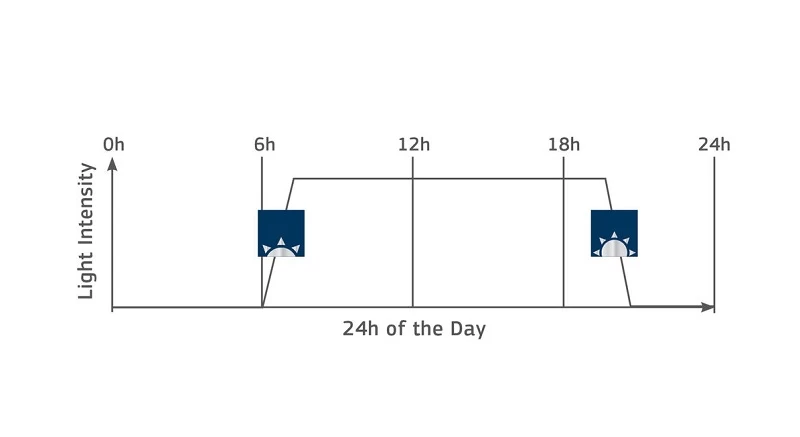 Schnell und einfach lässt ein individuelles Lichtprofil einer NovoLux LED Leuchte durch zwei Dimmphasen (Sonnenaufgang und Sonnenuntergang) programmieren. Die Startzeitpunkte der beiden Dimmphasen (Sonnenaufgang und Sonnenuntergang) können individuell definiert werden.