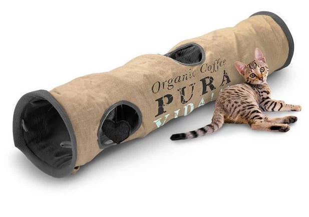 Die Katzenspieltunnel sind aussen aus Jute und innen aus Polyester hergestellt. Dank dem tollen Entwurf und der Färbung passen sie in fast jeden Haushalt. Die Tunnel haben 4 Eingänge und zwei davon sind mit Spielzeug versorgt. Der Rascheleffekt ermuntert die Katzen zum Spielen.