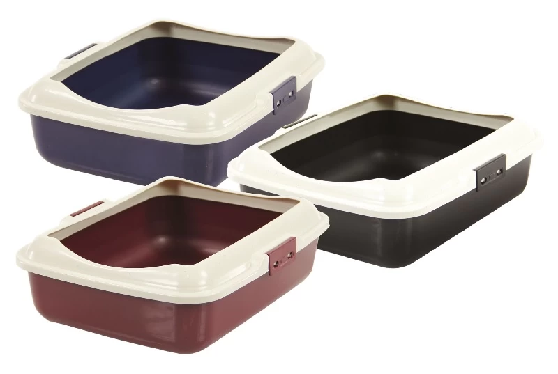 Eine Katzentoilette aus Plastik, mit abnehmbarem Rand.