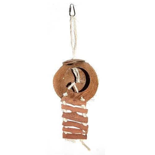Das Kokosnuss Kugelhaus hat eine Leiter und eine Seilbefestigung. Es eignet sich für Hamster, Mäuse und Vögel. Die Kokosnuss kann auch mit Heu, Stroh oder sonstiges Nistmaterial gefüllt werden. Es ist ein Naturprodukt und kann ohne Probleme vom Tier angenagt werden.
