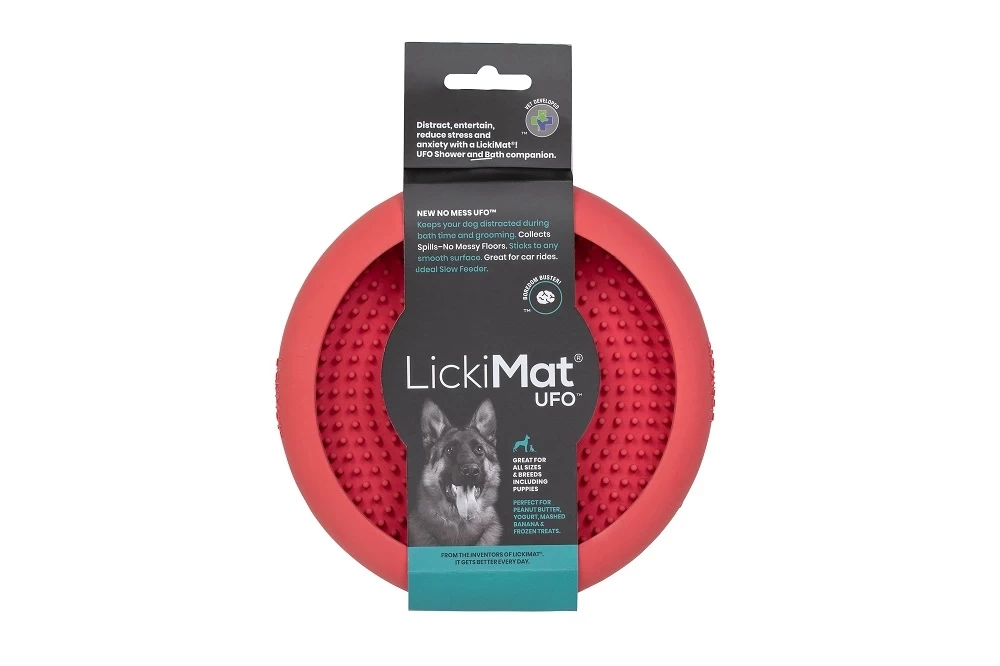 LickiMat® UFO – ist ein Napf mit Kautschuk-Noppen zur Beschäftigung von Hunden oder Katzen. Eine Beschäftigung kann beispielsweise im Falle einer Fellpflege oder eines Bades nötig sein. Sie streichen einfach eine Paste o. ä. in den Napf und Ihr Liebling wird sich damit ausgiebig beschäftigen und lecken.