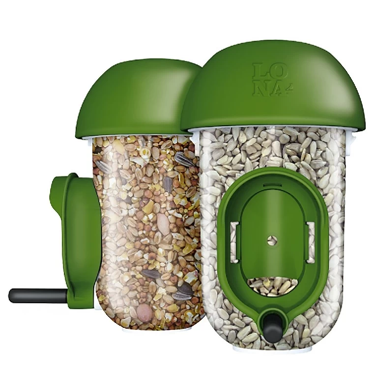 Das Silo kann ganz einfach an einem Baumstamm, einem Zaun, einer Mauer oder einer Pergola angebracht werden, da es über einen Klettverschluss verfügt. Das Silo wird mit zwei Behältern geliefert, beide für Sämereien. So ist für viel Abwechslung gesorgt und Sie können verschiedene Gartenvögel/Wildvögel damit füttern.
