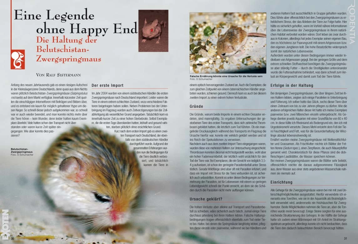 tetradactyla) oder der Baluchistan-Zwergspringmaus (Salpingotus michaelis) bisher gar nicht gelang. Die Titel-Tiere der nächsten Ausgabe der RODENTIA Exoten haben also bislang viele Geheimnisse für sich bewahrt – einer der Gründe, warum wir die Familie Dipodidae, zu der übrigens auch die weniger bekannten Hüpf- und Birkenmäuse zählen, in den Mittelpunkt unserer nächsten Ausgabe stellen.