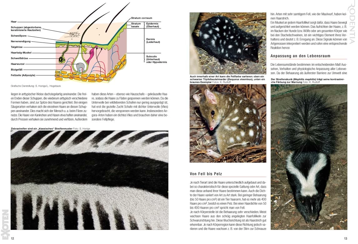 Für alle Säugetiere spielt die Körperbehaarung eine entscheidende Rolle im Hinblick auf den Grad der Anpassung an ihren jeweiligen Lebensraum. Folglich finden sich auch unter den Kleinsäugern Arten mit verschiedensten Fellen: Vom Polarfuchsfell, dem Fell mit den besten Isolationseigenschaften im Reich der Säugetiere, über das wasserdichte Otterfell bis hin zur feinen Behaarung des Nacktmulls und den „Waffen“ des Stachelschweins ist eine riesige Bandbreite an Anpassungen zu beobachten. Welche Besoderheiten sich für die Pflege exotischer Kleinsäuger aufgrund ihrer Behaarung ergeben, soll im Fokus des Titelthemas RODENTIA Exoten stehen.