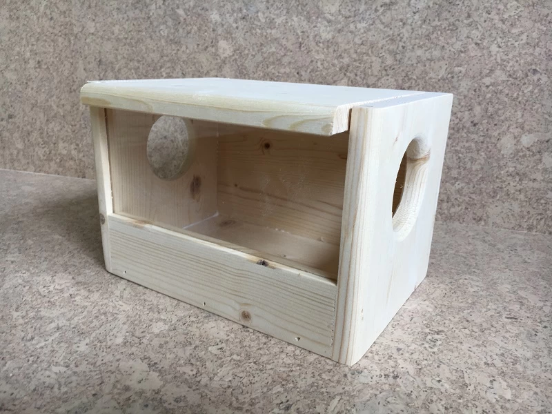 Das Sandbadehaus ist aus Fichtenholz und eignet sich für Degus und Rennmäuse. Der Deckel kann aufgeklappt werden und die Plexischeibe ist herausnehmbar. Auf beiden Seiten hat es eine Einstiegsöffnung für das Tier.