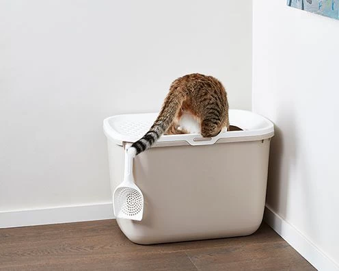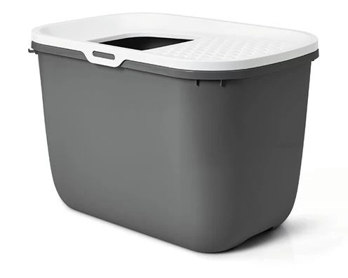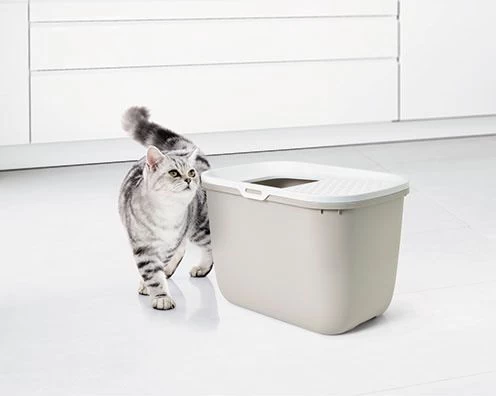 Der Hop In ist ein modernes Katzenklo mit Top-Einstieg und ist sehr empfehlenswert für Katzen, die stehend pinkeln, rückwärts pinkeln oder gerne scharren, wobei die erhöhten Seiten den Katzensand, Flüssigkeit und Schmutz in der Schale halten.