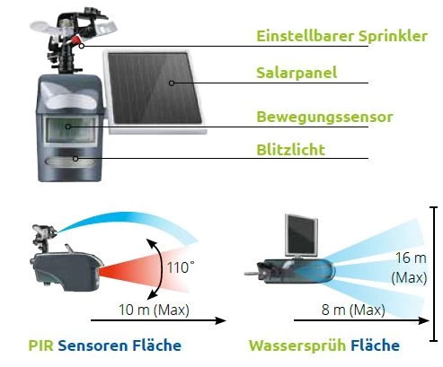 Sprinkler mit Bewegungssensor, der unerwünschte Besucher erkennt und sie mit einem starken Wasserstrahl und Lichtblitzen (LED) vertreibt. Einfache Installation, laden Sie die Batterien auf und schliessen Sie den Sprinkler an einen Gartenschlauch an und er ist betriebsbereit.