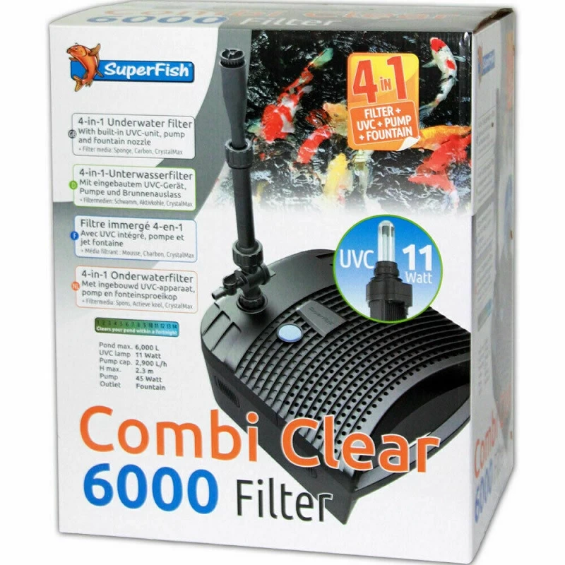 Combi Clear 6000 : Teich max. 6000 L, UVC-Lampe 11 Watt, Pumpenkappe. 2.900 L/h, H max. 2,3 m, Pumpe 45 Watt, Auslaufbrunnen