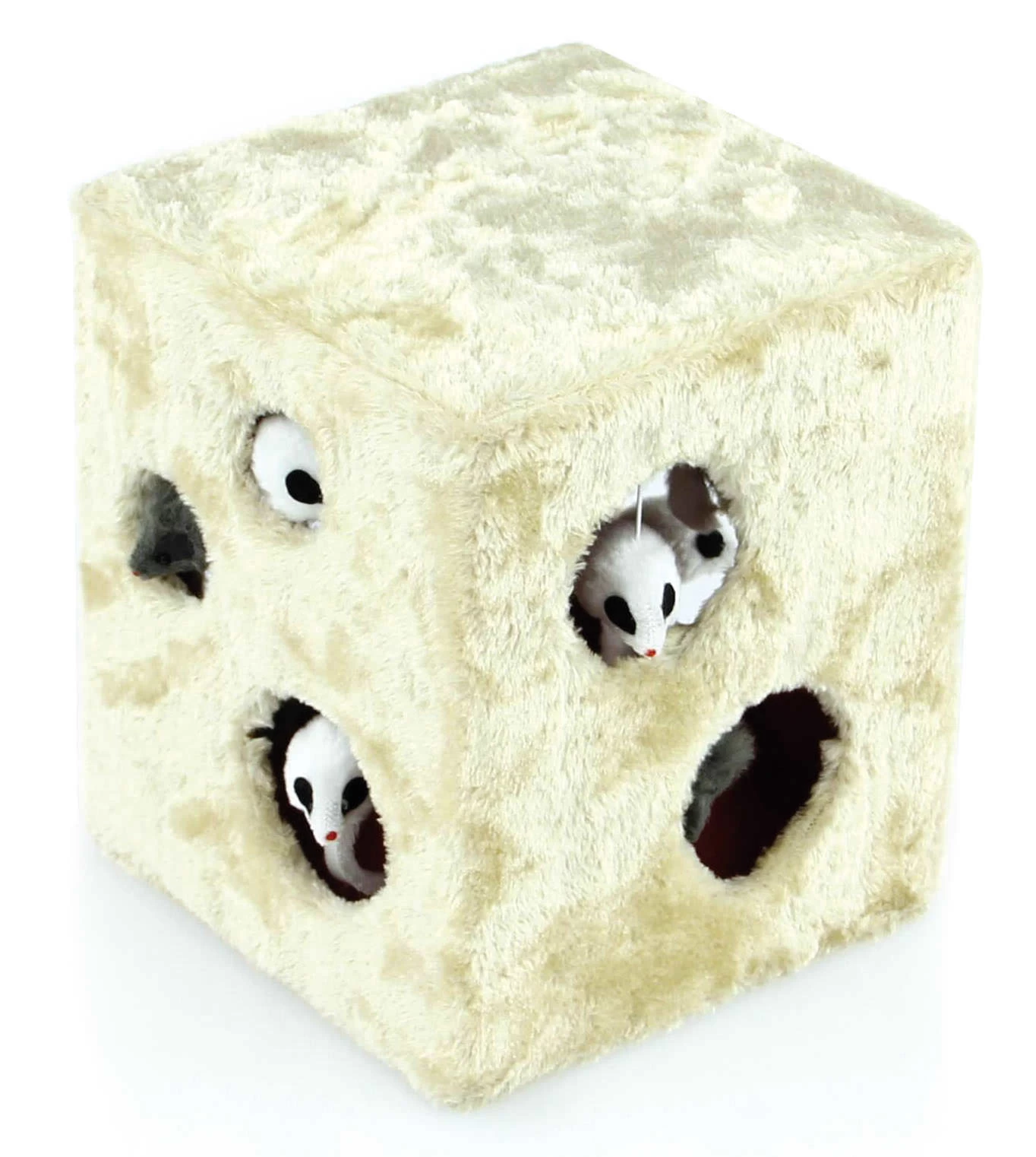 Swisspet Spielwürfel für Katzen mit verschieden grossen Mauselöchern, aus denen je eine Plüschmaus herausschaut…