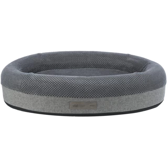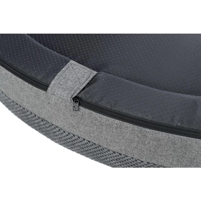 Das Bett Eliano ist ein grosser orthopädischer Schlafplatz und Rückzugsort für Ihren Hund. Der orthopädische Effekt sorgt für maximalen Komfort und kann gewisse Krankheiten vorbeugen. Das Kissen im Bett ist fest integriert und besteht aus Plüsch/Webstoff. Der Bezug ist aus Polyester und kann abgezogen werden, für eine einfache Reinigung (30 Grad in der Waschmaschine). Die Liegefläche hat ein zwei Schichten System mit viskoelastischem Memory Foam. Der Rand ist eine Schaumstofffüllung und ist extrem weich.