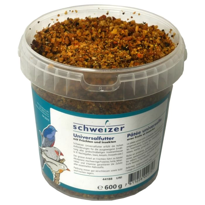 Universalfutter mit Früchten, Insekten und Lecithin. SCHWEIZER Universalfutter erfüllt die hohen Anforderungen für die ausgewogene Ernährung aller grobschnäbligen Insektenfresser (z.B. Nachtigallen, Stare, Amseln, Drosseln usw.).