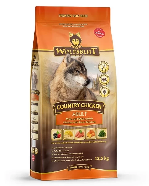 In den Rocky Mountains Nordamerikas, der arktischen Tundra, den Bergen und Wäldern Europas bis hin zu den Wüsten und Steppen Zentralasiens jagen Wölfe ihre Beute. Diese versorgt sie mit Fleisch und nährstoffreichen Innereien, aber auch mit Gemüse, Früchten, Beeren, Wurzeln und Kräutern über den Mageninhalt der Beute. Getreide gehört hier nicht dazu. So erhält der Wolf seine benötigten Vitamine, Mineralstoffe, Spurenelemente, Enzyme und sekundären Pflanzenstoffe. Da der Wolf der Urahn aller Hunde ist, orientiert sich unser Wolfsblut Hundetrockenfutter an diesen natürlichen Fressgewohnheiten des Wolfs. Es enthält viel Fleisch oder Fisch kombiniert mit Superfoods, die wertvolle Inhaltsstoffe enthalten – und das wie in der Natur, ganz ohne Getreide. Unsere Auswahl an außergewöhnlichen Fleischsorten und nährstoffreichen Superfoods baut dabei auf den Lebensräumen des Wolfs und deren bunter Nahrungsvielfalt auf. Wolfsblut bietet jedem Hund eine artgerechte und ursprüngliche Ernährung und mit seiner Sortenvielfalt ist für jeden etwas dabei, das er verträgt. Die Rezeptur von COUNTRY CHICKEN ADULT Trockenfutter verbindet die Nahrung des Wolfs mit den neuesten wissenschaftlichen Erkenntnissen über richtige Hundeernährung.
