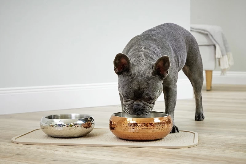 Die schöne gehämmerte Struktur ist von Hand geschlagen, so ist jeder Napf ein Unikat. Durch den rutschfesten Boden und das hohe Eigengewicht kann der Hund in aller Ruhe sein Futter geniessen, ohne dass der Napf über den Boden geschoben wird. Der Napf eignet sich gleichermassen für Wasser-, Nass- oder Trockenfutter.